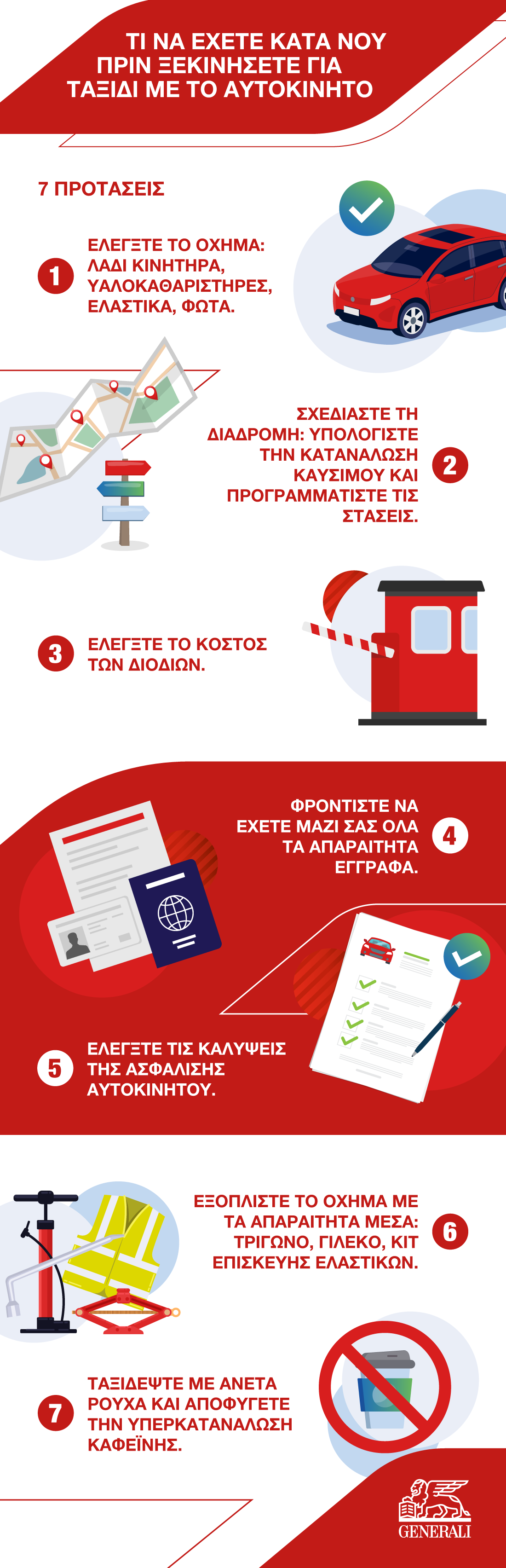 Οι παραπάνω συμβουλές πιστεύουμε ότι μπορούν να διασφαλίσουν τις ιδανικές συνθήκες για πολλά απροβλημάτιστα ταξίδια. Επειδή, όμως, πάντα μπορούν να συμβούν απρόοπτα, προτείνουμε να συζητήσετε με έναν ασφαλιστικό σύμβουλο της Generali, για να βρείτε ποιο πρόγραμμα ασφάλισης αυτοκινήτου ανταποκρίνεται καλύτερα στις δικές σας ανάγκες.