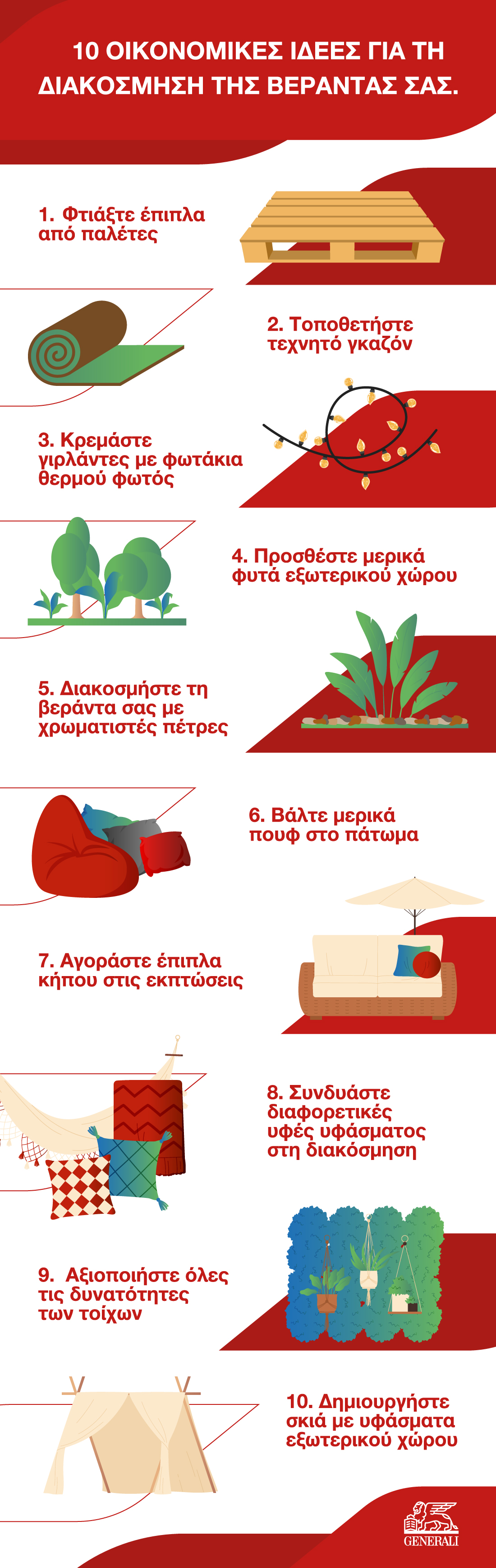Για να ομορφύνετε τη βεράντα, την είσοδο του σπιτιού ή το μπαλκόνι σας πρέπει να έχετε γούστο – και χρήματα! Αναρωτιέστε όμως πώς μπορείτε να διακοσμήσετε τη βεράντα σας χωρίς να ξεφύγετε από τον προϋπολογισμό σας; Και όμως, υπάρχουν πολλοί τρόποι να κάνετε τον υπαίθριο χώρο του σπιτιού σας να μοιάζει με ονειρεμένη καρτ ποστάλ!